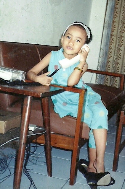 Saya ketika berumur 5 tahun (juga) dengan genitnya berpose menggunakan high heels Mama saya, bergaya seperti sekretaris yang sedang menerima telepon dari klien
